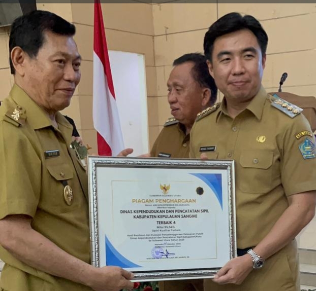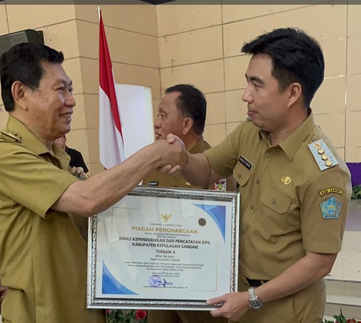 Penghargaan tersebut diberikan kepada Dinas Kependudukan dan Pencatatan Sipil Kabupaten Kepulauan Sangihe yang berhasil meraih peringkat ke-4 dengan nilai 95,54 dan mendapatkan opini kualitas terbaik berdasarkan hasil penilaian dan evaluasi penyelenggaraan pelayanan publik Dinas Dukcapil kabupaten/kota se-Sulawesi Utara tahun 2025.