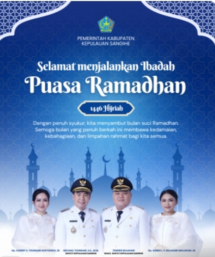 Sebagai pemerintah daerah Bupati Michael Thungari SE MM bersama wakil bupati Kepualauan Sangihe Tendris Bulahari tak lupa mengucapkan selamat menjalankan ibadah puasa bagi seluruh umat islama yang ada di Kabupaten Kepulauan Sangihe.